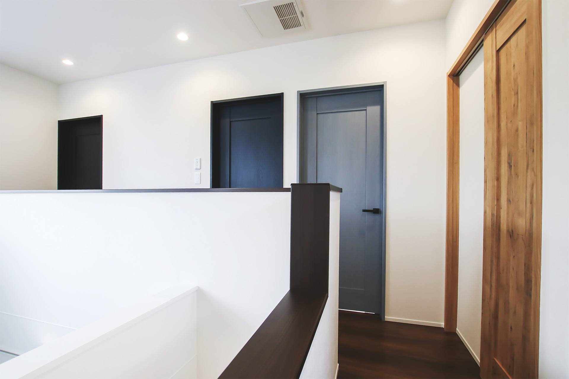 1階は落ち着いたシックな印象に、2階の部屋の扉を全室色を変えたり、トイレの壁紙にこだわるなど楽しい印象を目指しています。」